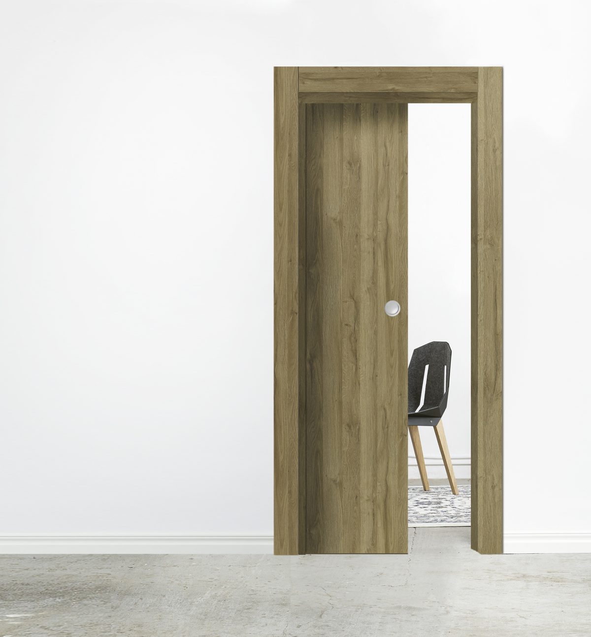 W systemie naściennym MAGIC do skrzydeł drewnianych prowadnice i mocowania są niewidoczne zarówno przy drzwiach otwartych, jak i zamkniętych.
